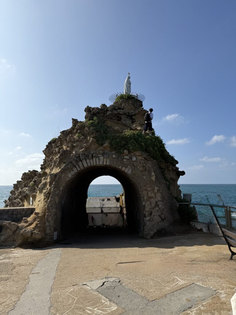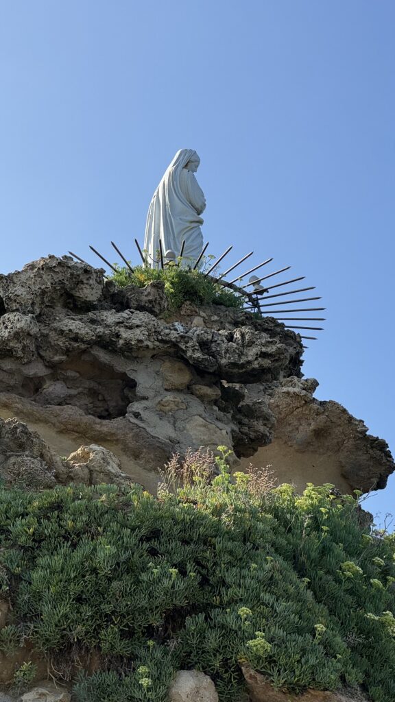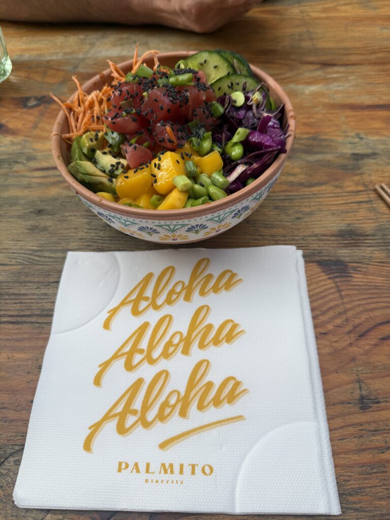 That evening we strolled along the coast to Rocher de la Vierge — “The Rock of the Virgin.” The statue there was placed by fishermen in 1865 after a storm they miraculously survived. The sea was wild that night, waves crashing over the promenade, soaking anyone who lingered too close. Z thought it was the best thing ever. We wandered until we stumbled upon Palmito, a trendy food hall with five different restaurants — Rob and Z had tacos (again!) I had a poke bowl. Palmito has laid-back vibe. We loved it so much we went back the next day for brunch and some exploring.