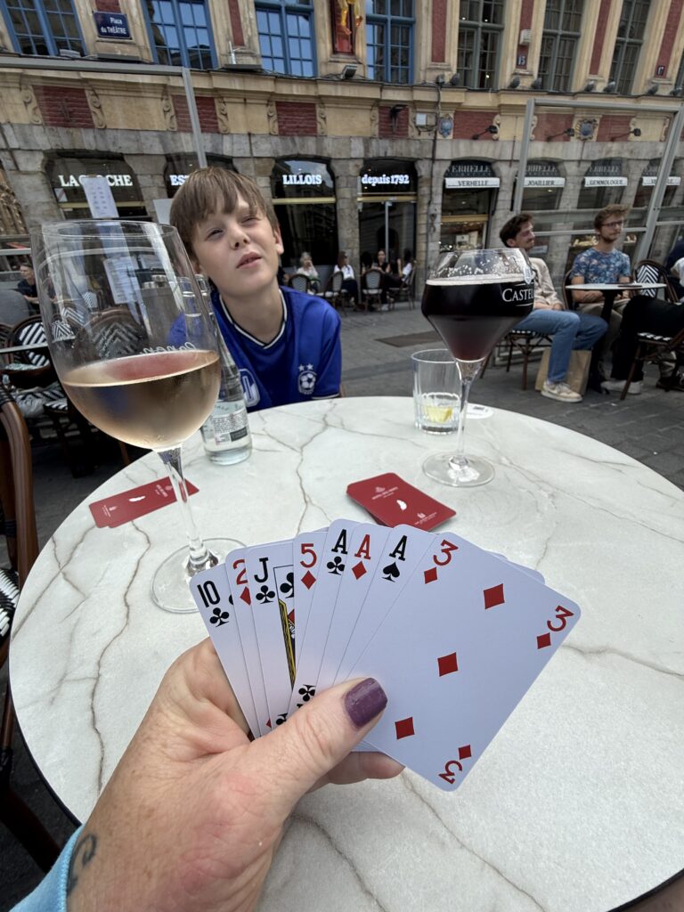 This whole trip was train-only, which turned out to be easy and surprisingly affordable. We took the train from Amsterdam to Lille (about three hours). After checking into our hotel, we wandered the cobbled streets, waiting for dinner hours to roll around — since everything in Lille and most of France closes mid-afternoon and reopens at seven. We passed the time with drinks (apple juice for Z) and endless rounds of Go Fish and Slapjack. When dinner finally rolled around, we found a taqueria called Nomas. I know, I know — Mexican food in France?! But when you live in the Netherlands, you understand. Finding good tacos is a quest. And wow, Nomas did not disappoint. Best tacos we’ve had since Portugal.