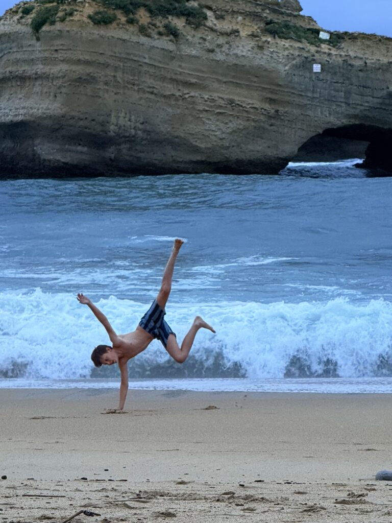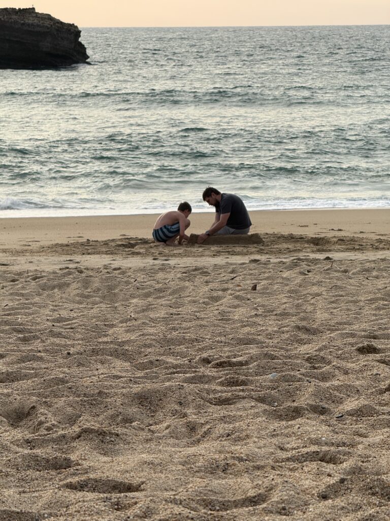 Biarritz is luxury without pretense — a place where even Michelin restaurants feel casual, and there are no private beaches. Our days fell into a lovely rhythm: morning coffee on the balcony, lazy beach hours, amazing dinners followed by wine on the beach admiring some of the most breathtaking sunsets . Each night, Z rebuilt his sandcastle only to watch the waves wash it away — and each night, he perfected it a little more.